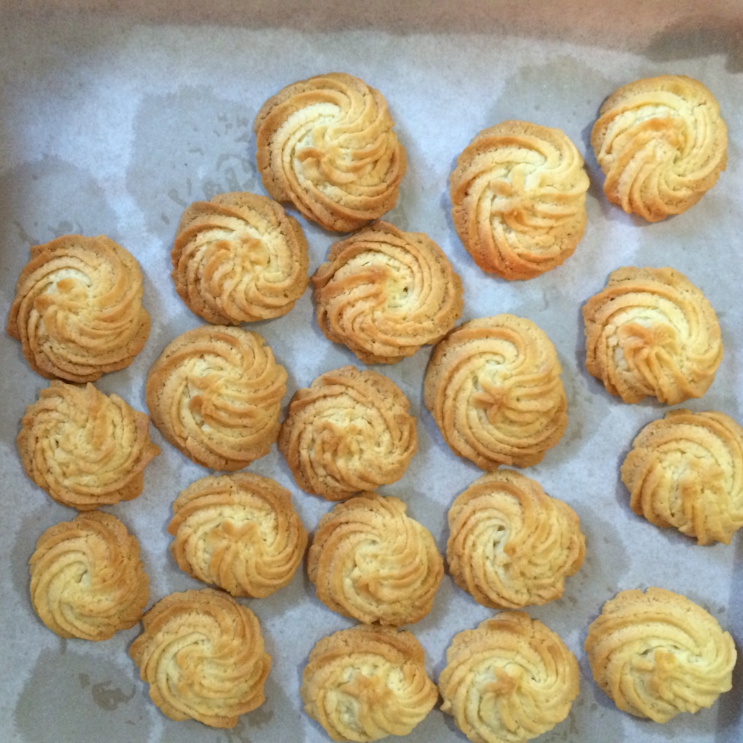 打蛋器坏了,用厨师机太少量感觉不是很好用,有点油,烤箱火力太大了点,宝贝喜欢吃曲奇,减了点糖,不会裱花,换个打蛋器再做了!