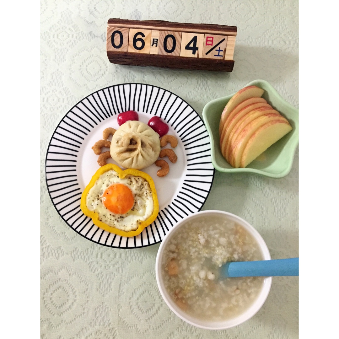 娃的早餐:杂粮粥,彩椒煎蛋,包子,苹果