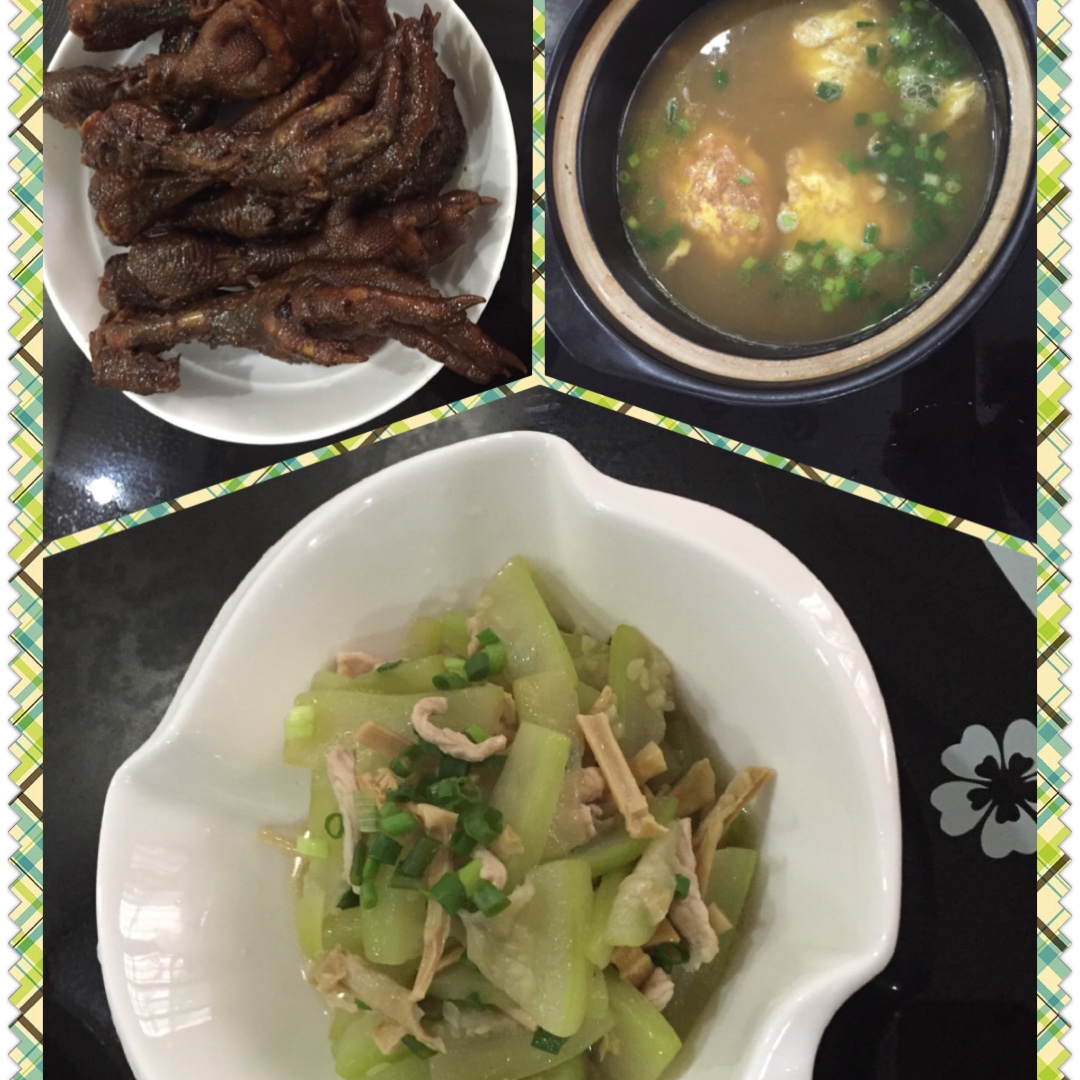 晚餐:笋干,肉丝,瓠瓜。粉丝➕蛋饺,毛豆汤,红烧鸡爪