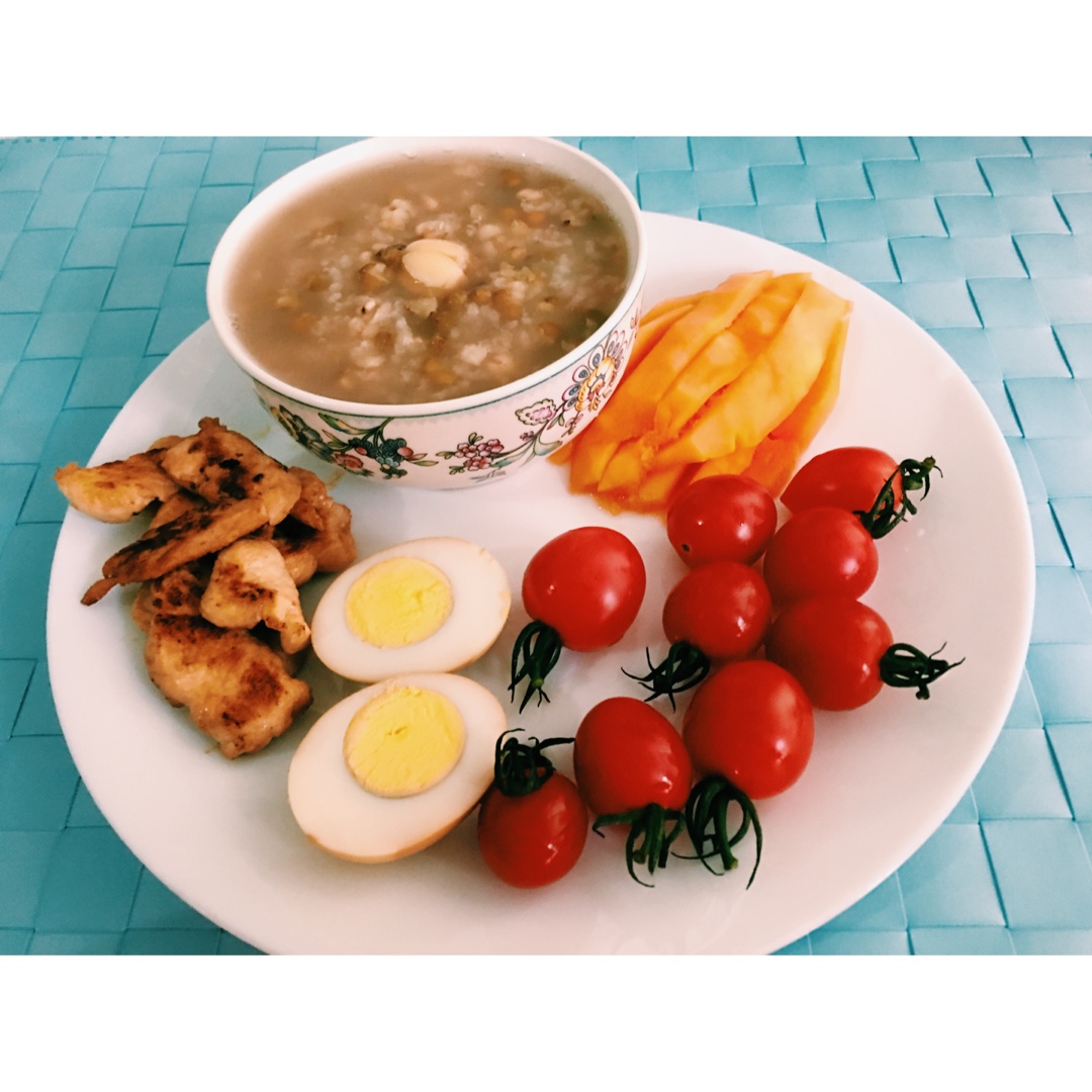 早安,绿豆薏米莲子粥、煎鸡胸肉、卤鸡蛋、木瓜和小番茄