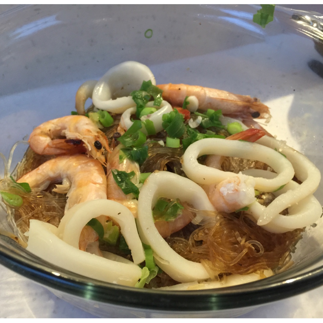 倒油,培根铺底,生姜蒜头,放粉丝,倒料酒,各类酱油,蚝油,海鲜,葱,一点水,盖盖子,别打开,直到海鲜熟透。