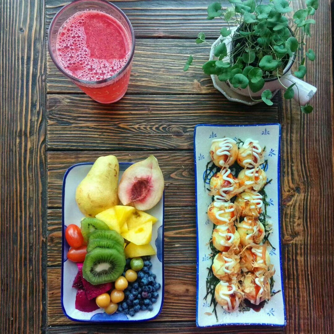 章鱼小丸子,水果,鲜榨西瓜汁!