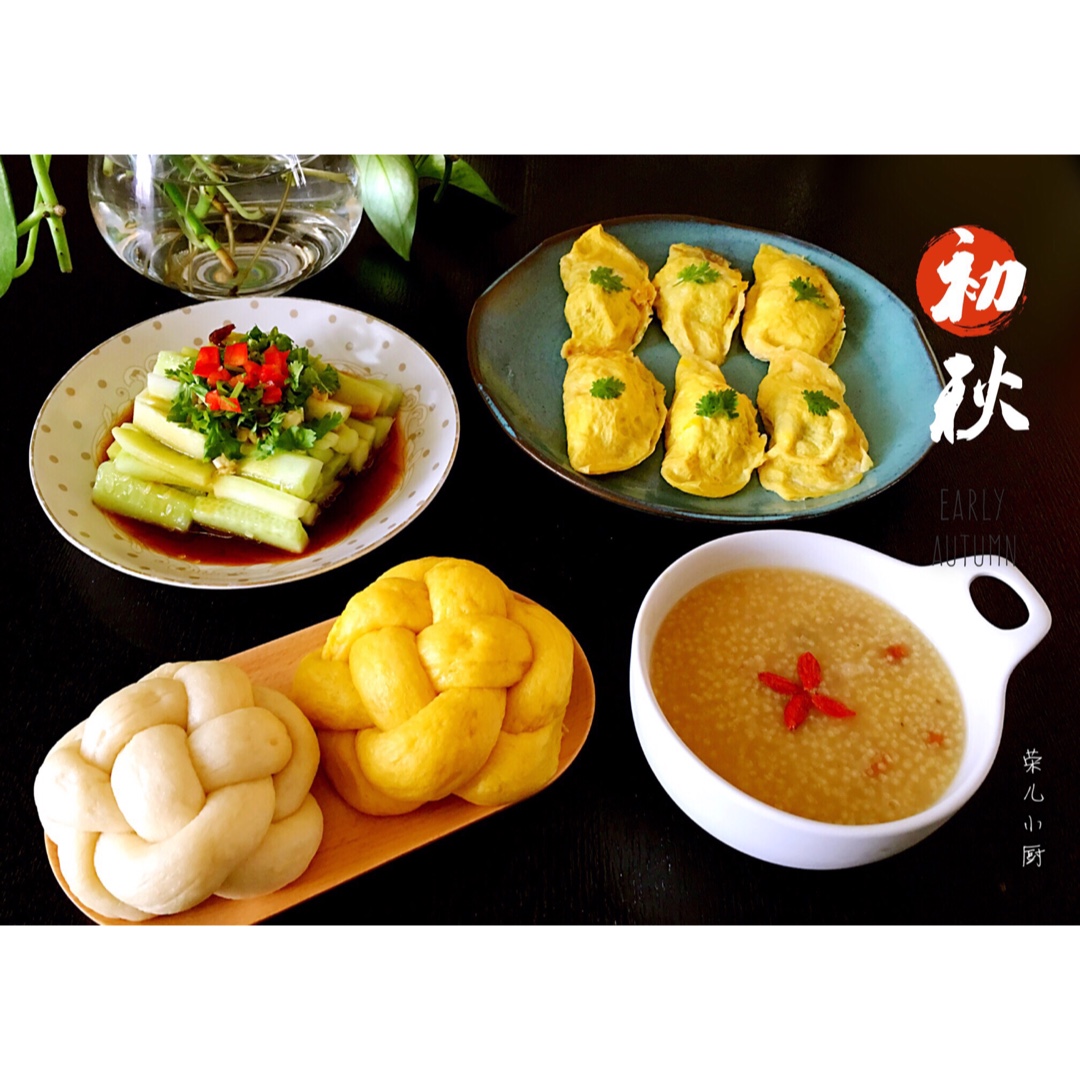 早餐:绣球馒头、蛋饺、枸杞桂圆小米粥、凉拌黄瓜