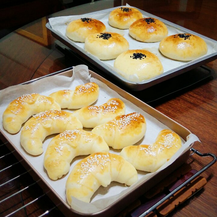 圆的是黄桃乳酪包,迷你牛角包,这次烤的牛角包上色很好看(๑•ั็ω•็ั๑)但是我p的不好看😂😂