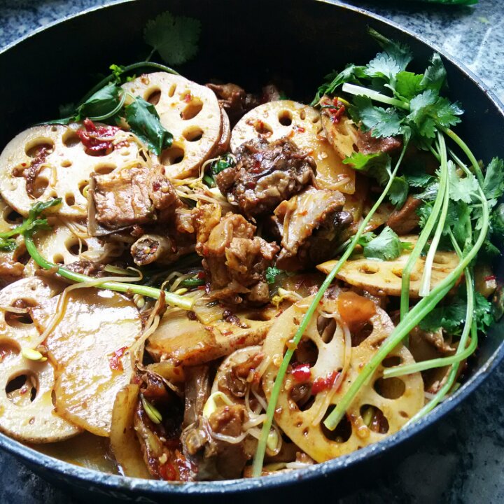 干锅辣子鸡(?)总之就是把炒好的辣子鸡拿来做干锅了,藕片超级棒