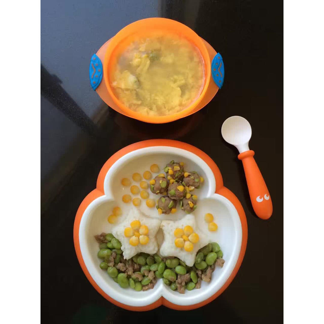 小胖午餐:🌽玉米肉丸球➕毛豆炒肉➕蛋花汤➕星星饭团🍙