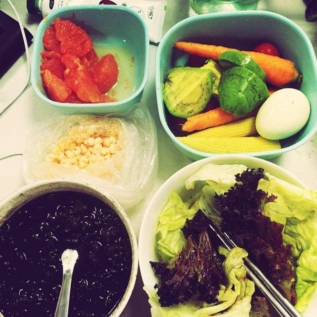 黑米糯米黑豆红豆粥 生菜沙拉配油醋汁 鸡蛋牛油果胡萝卜玉米笋小番茄 西柚 虾仁