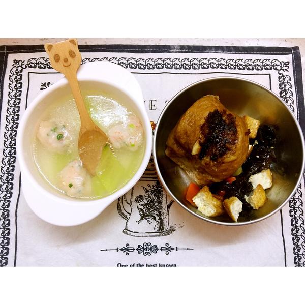儿子午餐:红糖馒头➕焦溜豆腐➕虾丸汤。