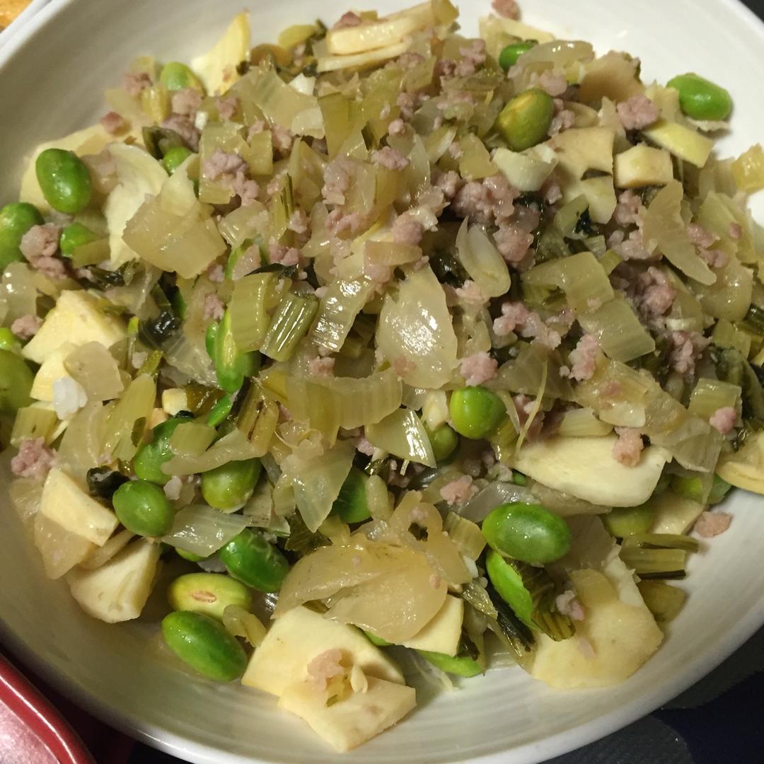 冬笋冬腌菜炒肉沫毛豆,冬季美味