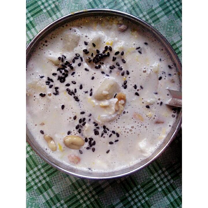 牛奶香蕉花生米黑芝麻酒酿蛋一大碗,好吃。