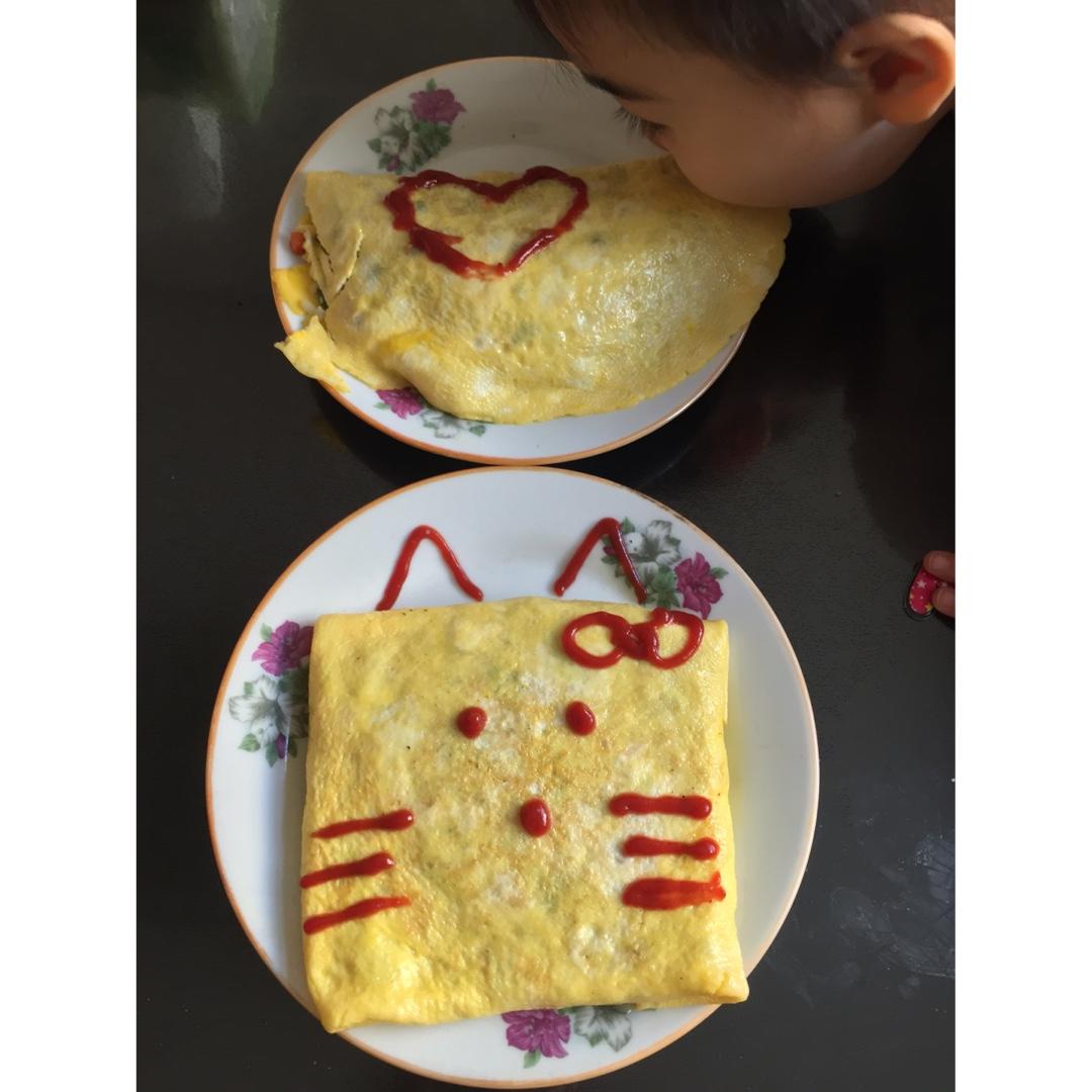 今天把剩下的米饭都做了。蛋饼定型趁上面蛋液还没凝固时放米饭包,确实有点费劲,今天给爸爸的大份做的比较美观,宝宝抢着画番茄酱,还着急的啃了几口。小份的直接包成了大脸猫,哈哈~但宝宝依旧喜欢。