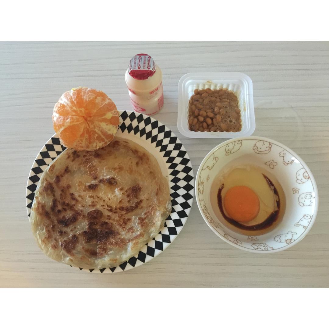 飞饼+橘子+纳豆+兰皇温泉蛋+养乐多