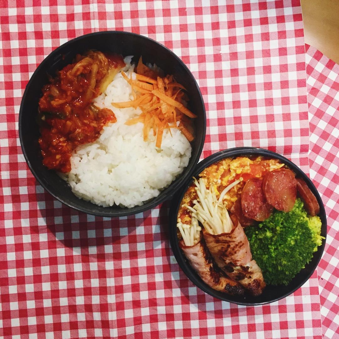 番茄炒蛋+金针菇培根+腊肠+泡菜
