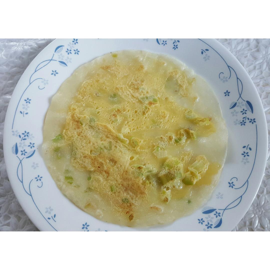 早晨~葱花蛋饼+木瓜银耳汤。一个香一个润。