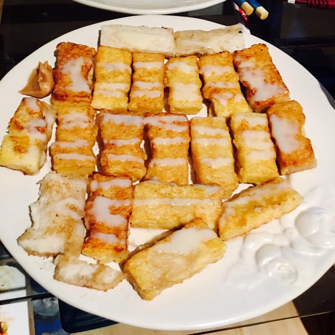 切成小块的西多士 和炼乳花生酱不能再配