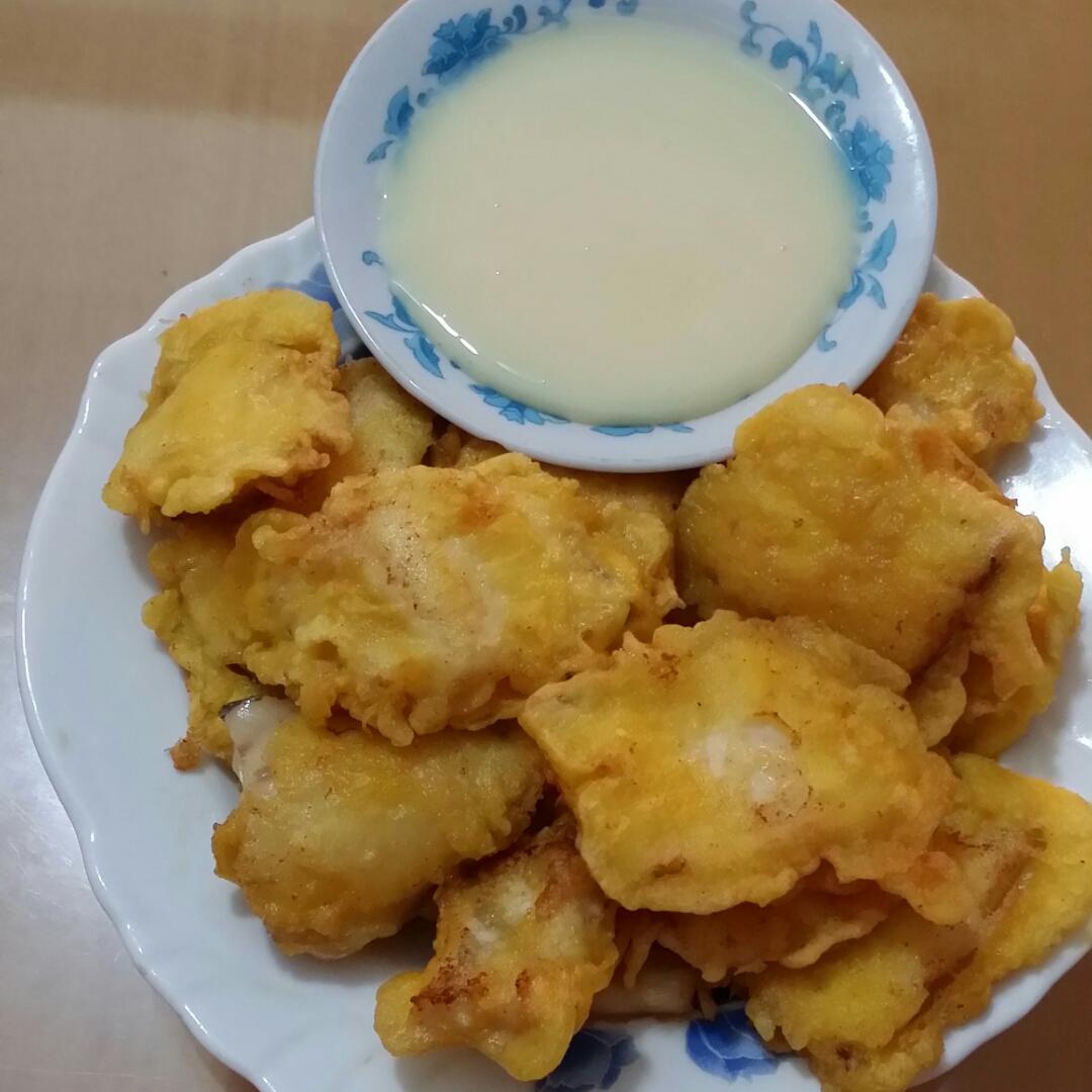蛋黄+吉士丁粉+面粉+少许水调成面糊,鲟鱼片沾满面糊入锅煎熟,沾炼乳入口甜美得很。