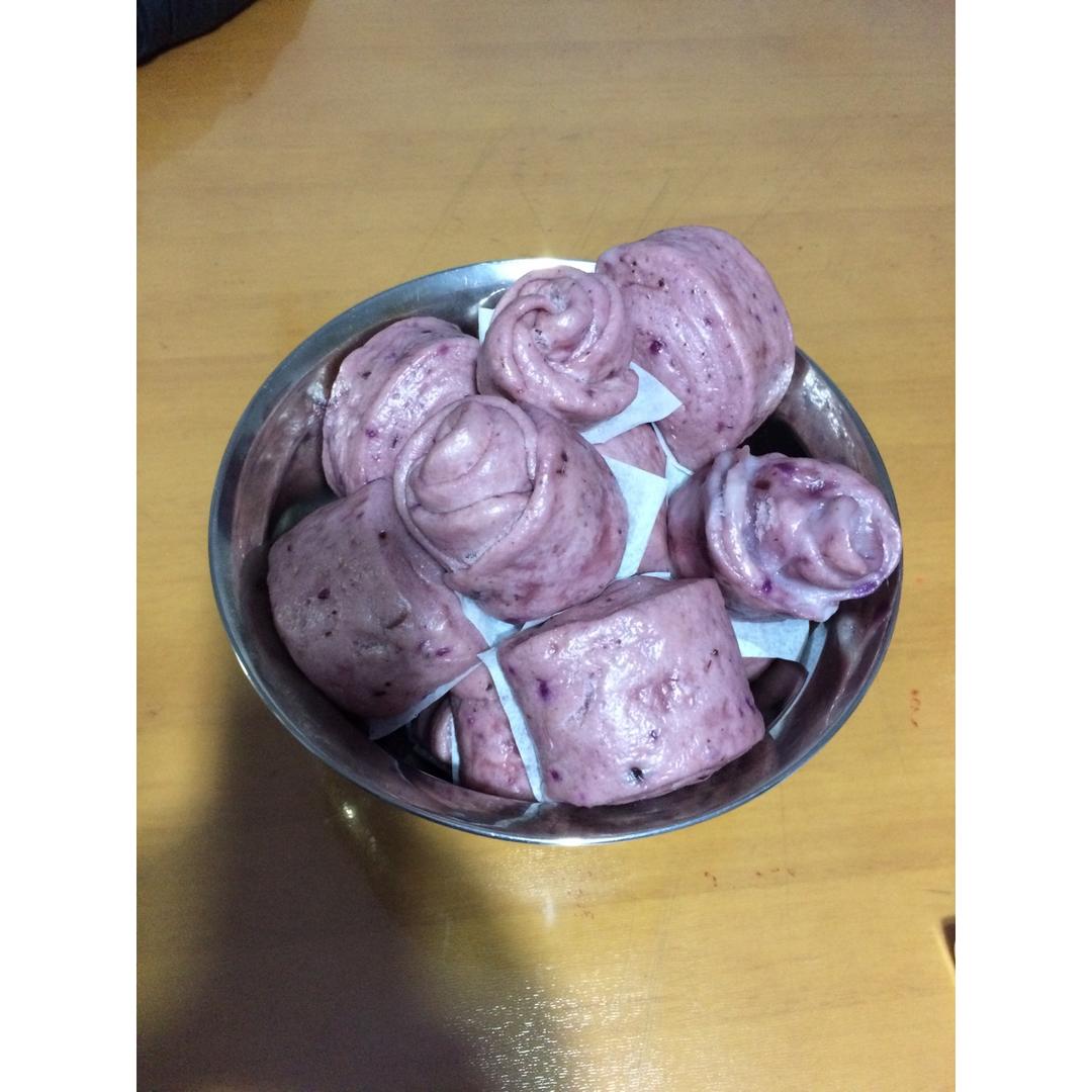 今天下午做的馒头,紫薯泥没压的很细腻没过筛,做出来就这样了,做了四多玫瑰花,其他都是刀切馒头了。