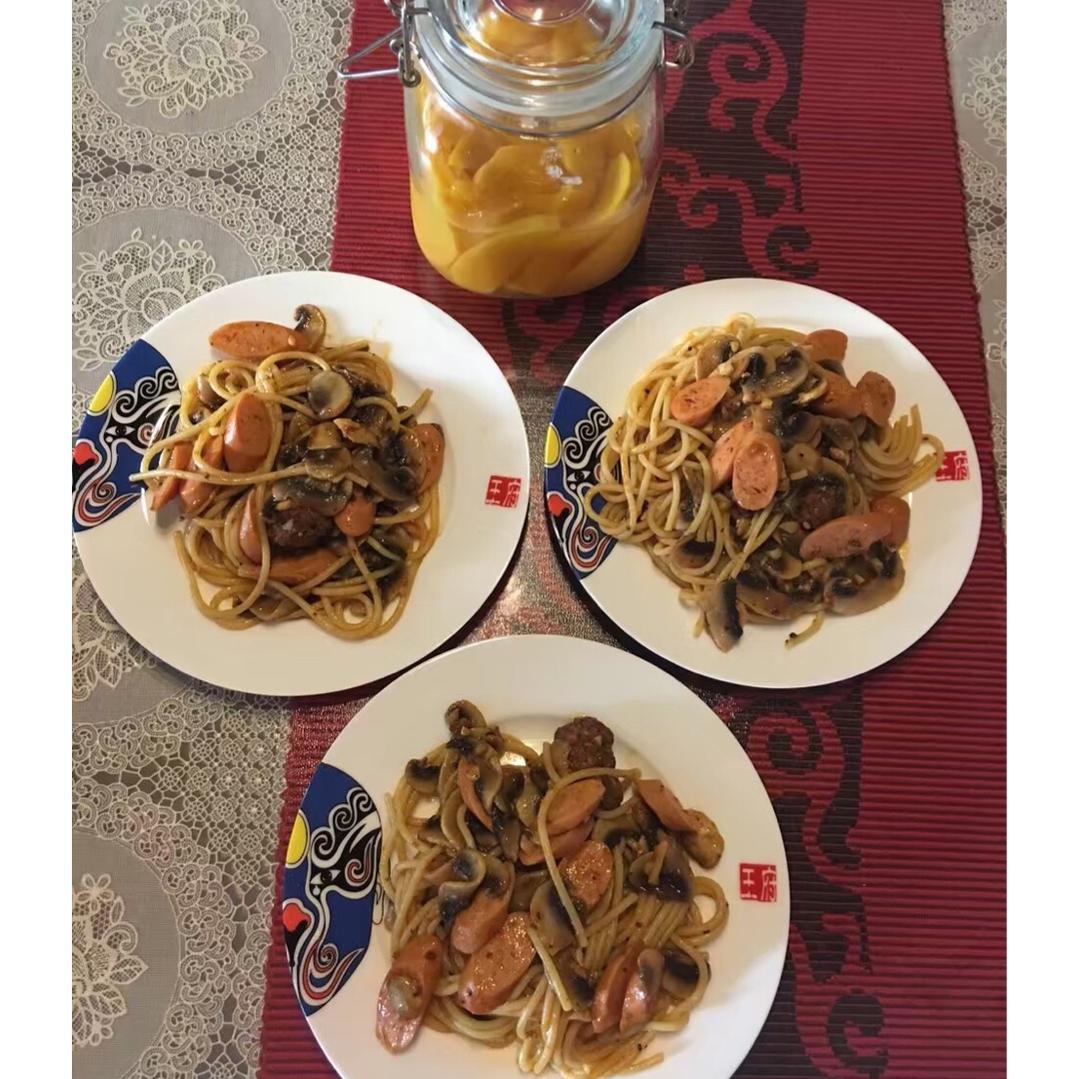 香肠意面配黄桃罐头~重口味早餐~
