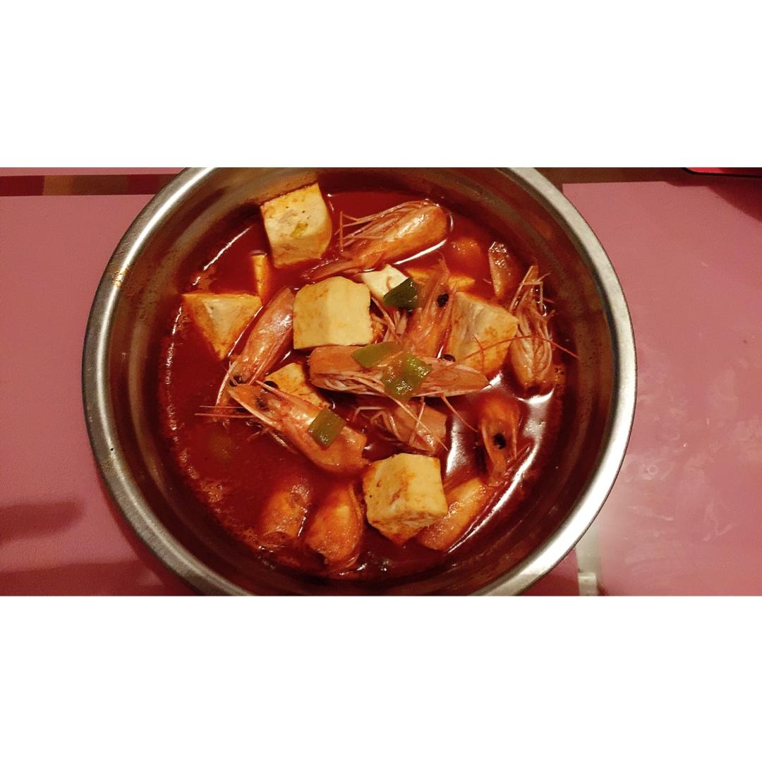 用白葡萄酒和盐腌一下虾头 油锅烧热放入虾头炒出虾油,放水煮沸后放入豆腐