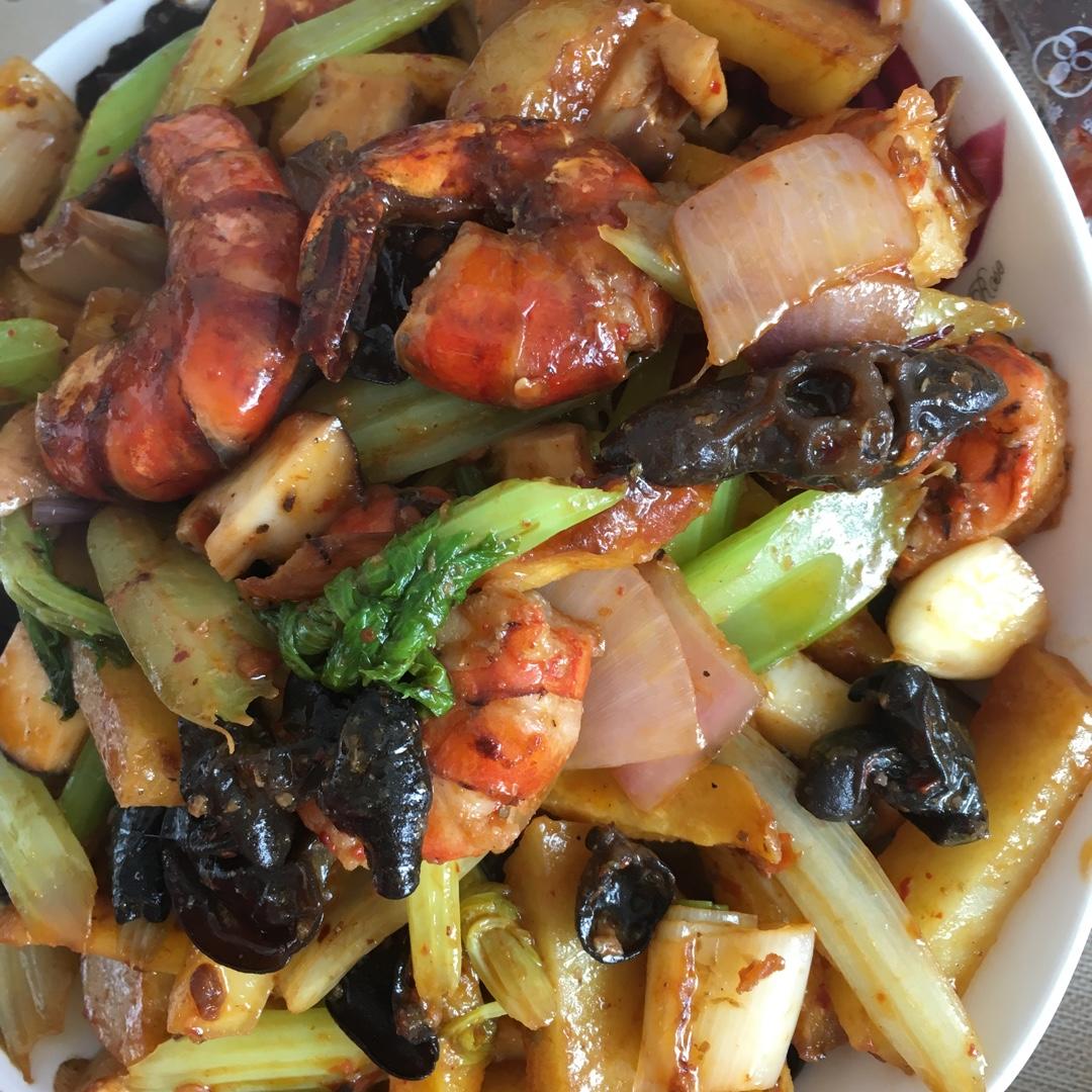 骁-8 做过 麻辣香锅 黑虎虾去头挑线洗净西芹切段 黑木耳 香菇土豆条、胡萝卜条过油炸熟油煸洋葱、葱姜蒜,放入西芹多炒一会,加鲜菇翻炒搏到一边再加少许油放入虎虾变红,挤入半袋香锅底料猛火,整个炒香,加入木耳和土豆🥕条最后少许盐马西达 #午餐•2017年2月17日# 2017-02-17