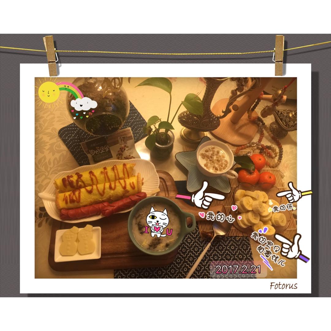 /ka清风百合 做过 早餐•2017年2月21日 💗早餐:肉松鸡蛋饼、台湾烤肠、酒酿芝麻馅圆子(哈哈,偷懒在微波炉烧化了)、水果麦片牛奶、每日坚果🌰、⛄️白色恋人、香蕉🍌、沙糖桔🍊。 #早餐•2017年2月21日# 2017-02-21