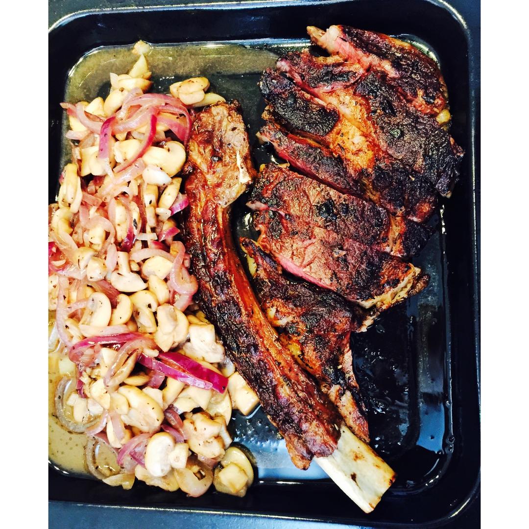 k_lu 做过 战斧牛排配褐菇红酒汁佐水牛芝士. Tomahawk steak with mushroom red wine sauce and buffalo mozzarella. 用了蘑菇~洋葱乱入 牛扒基本全熟,下次试试生一些 2017-02-26