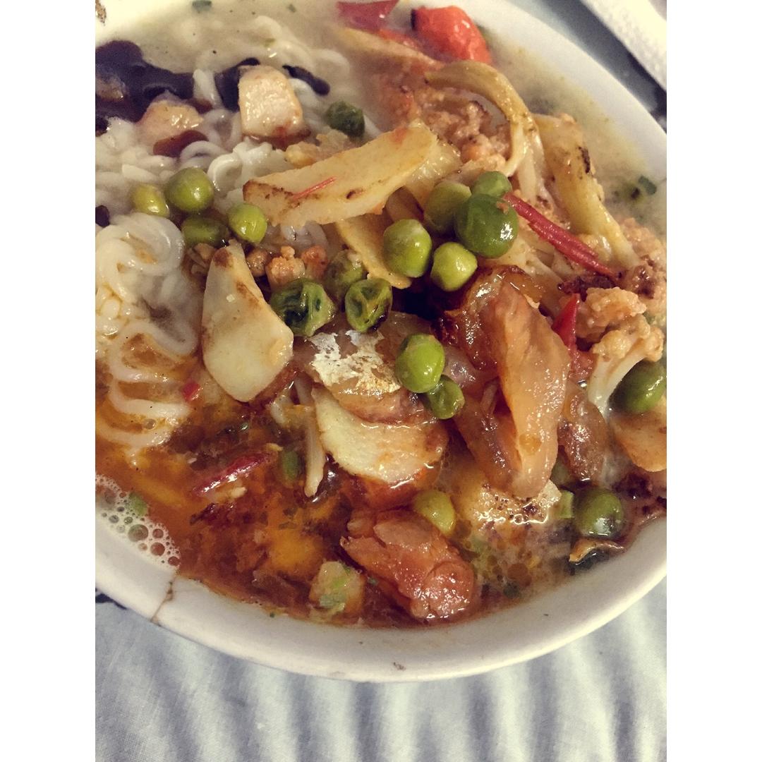 一年没吃🍜出前一丁,三文鱼🐠,🍅花椰菜青豆,汤底:🐖猪骨汤,最后一勺黑蒜油,🐃肉酱,吃出泡面新境界😋