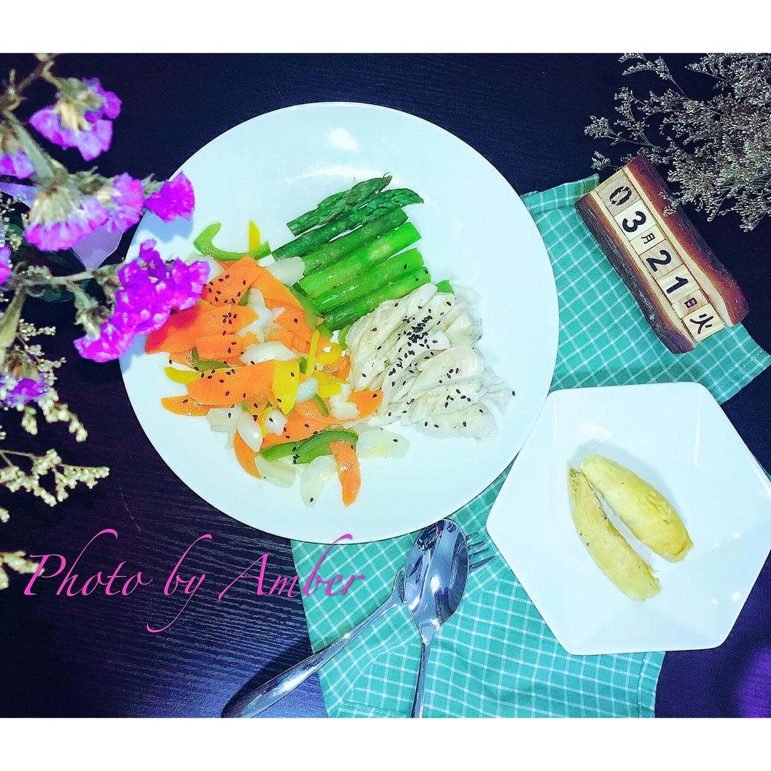 早上好😊😊早餐:水煮雞胸肉,蘆筍,胡蘿蔔百合彩椒沙拉,小紅薯。今天吃太飽了…😪😪
