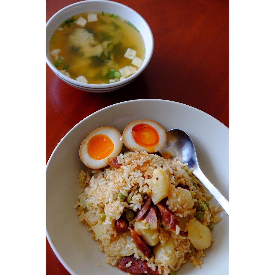 腊肠土豆豌豆饭+日式卤蛋+味噌汤