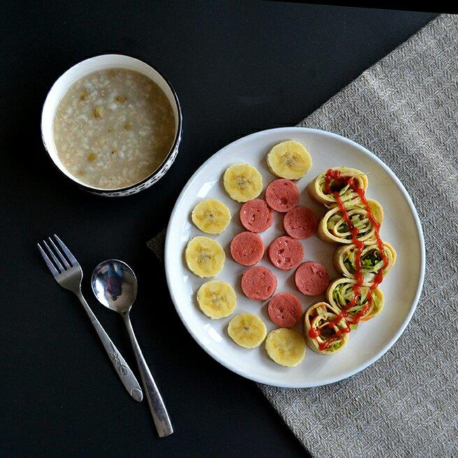 绿豆粥+生菜鸡蛋卷+热狗+香蕉。