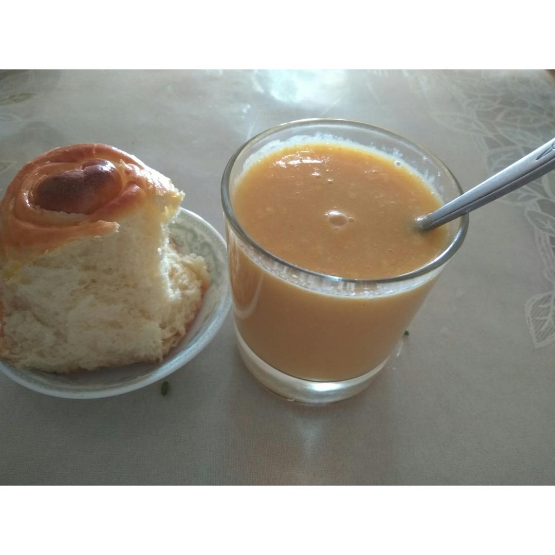 一根玉米,半根胡萝卜,一些麦片,用豆浆机打的不够细腻,不过味道不错,加块面包早餐解决了😂