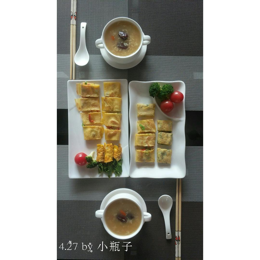 红枣枸杞大米粥,什锦蔬菜蛋卷,香椿蛋卷。
