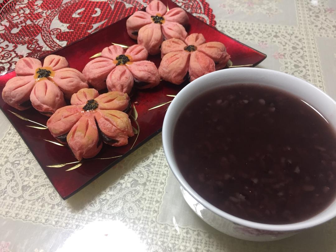 桃花酥是昨晚上烤好的,黑米粥是电饭煲预约做的。