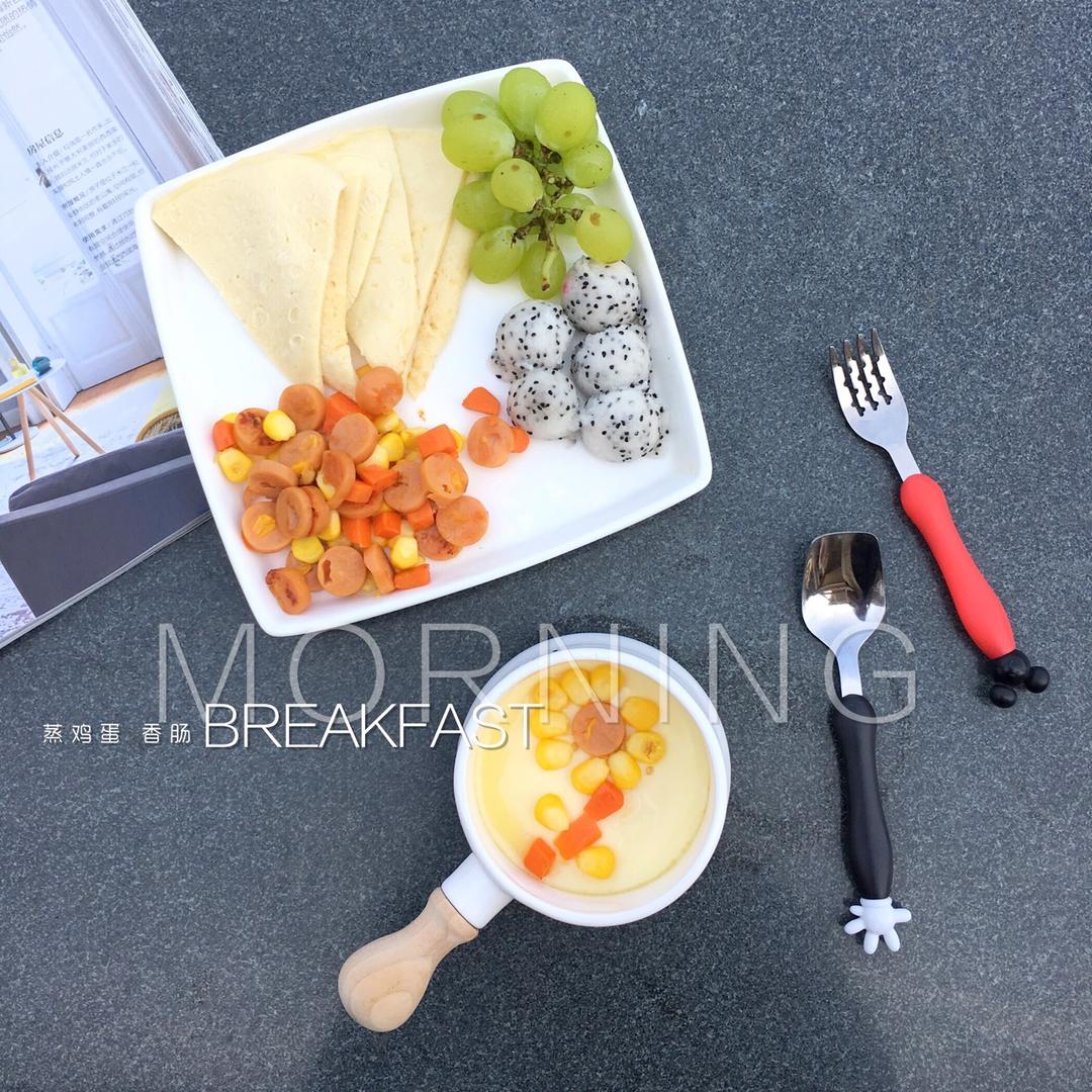 早餐打卡:蒸鸡蛋 香肠玉米萝卜 水果