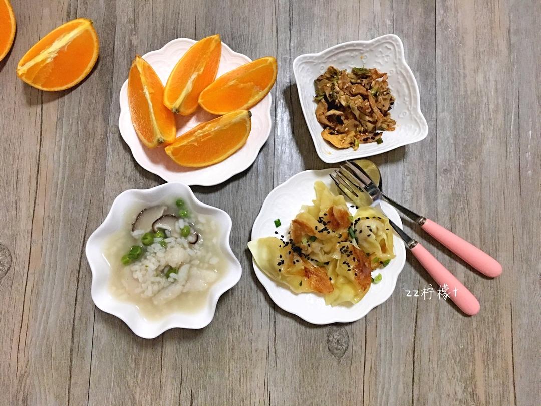 zz柠檬t 做过 早餐马拉松顺利收官:因为坚持,所以更好! #周末食#香菇青豆鱼片粥,生煎馄炖,儿菜干,橙子~温度骤降了十来度,一碗粥下肚暖意就上来了,还是最喜欢中式早餐,清粥小菜,十分惬意~ #早餐•2017年5月6日# 2017-05-06