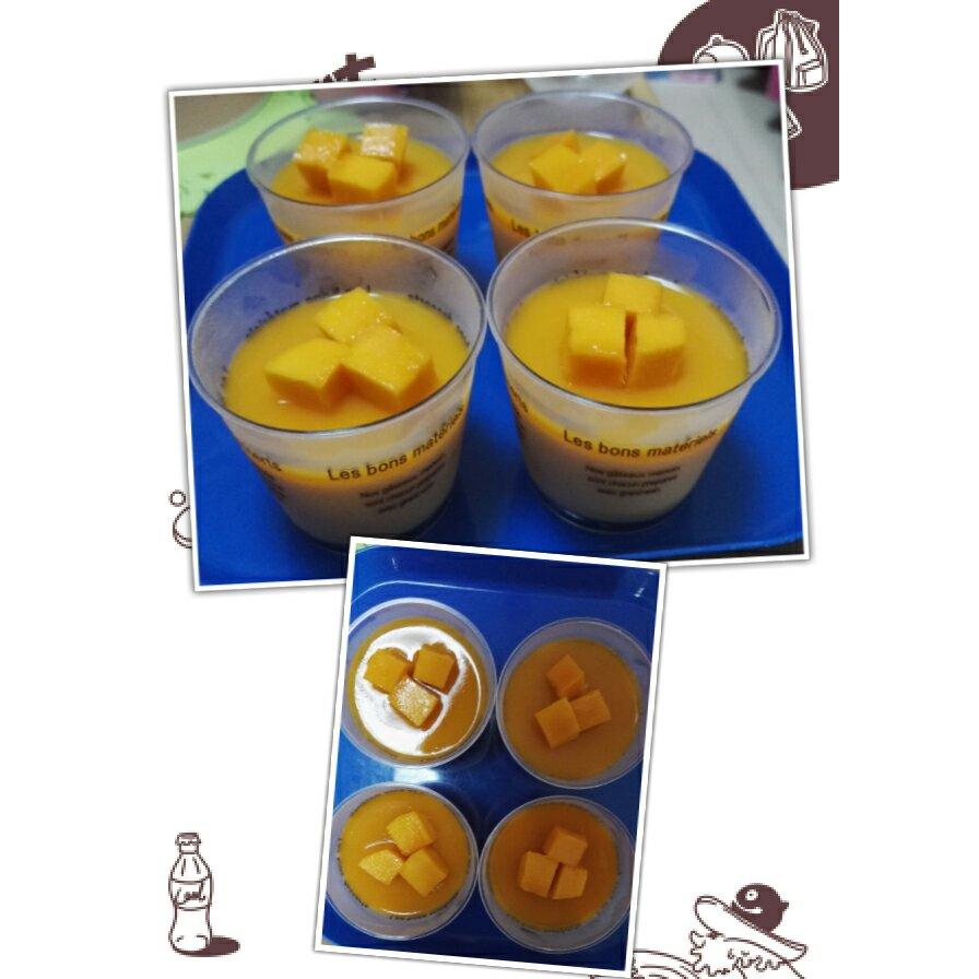 家里太多棉花糖,又买了芒果,刚好做布丁。怕不成功加了一点鱼胶粉。打了芒果泥加到奶棉花糖里,上层还加了芒果泥加冻开水放了鱼胶粉像果冻。成功!