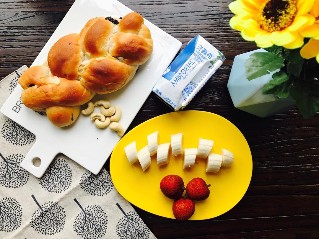 甜甜甜心的甜妈 做过 早餐•2017年5月24日 早上好😃超软葡萄辫子包+腰果+香蕉+荔枝+酸奶。这款超级大水量的面包导致整形被虐的不要不要的结果还是很难看,水量大所以也超软,经过郎姆酒浸泡的葡萄干风味十足。下次努力让整形好看些就完美了!😊 #早餐•2017年5月24日# 2017-05-24
