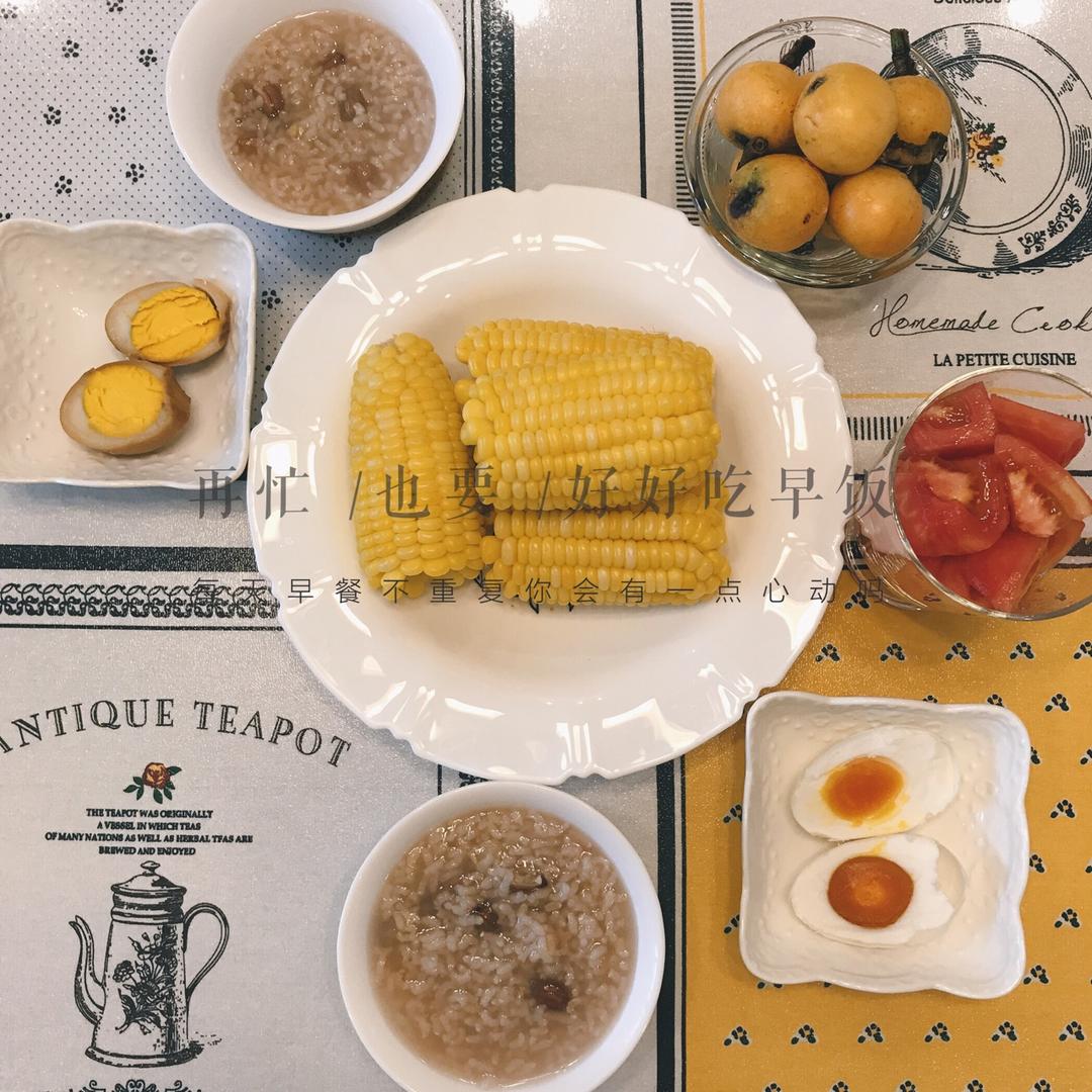 花生糙米粥 咸鸭蛋&卤鸭蛋 玉米 枇杷 糖番茄