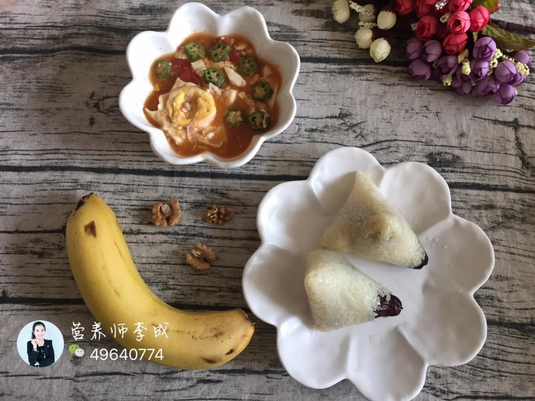 下厨房用户_7cznb 做过 早餐•2017年5月26日 妈妈的味道d46,粽子,内脂豆腐番茄秋葵汤,水煮蛋,香蕉,核桃,本想弄个造型蛋,结果,你能看出是半个五角星不[偷笑]早安💐 #早餐•2017年5月26日# 2017-05-26