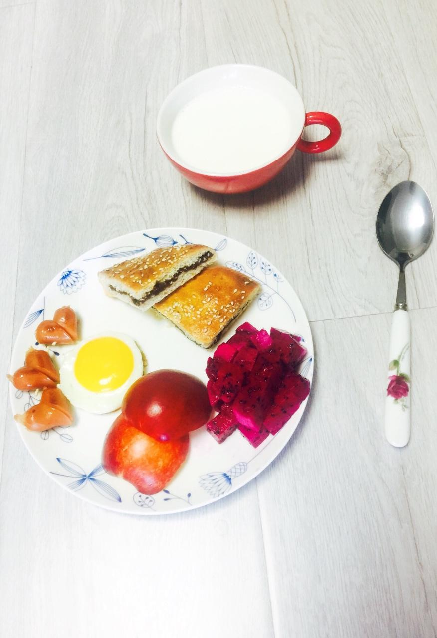 豆沙面包、脆皮肠、太阳蛋、黄桃、火龙果配牛奶