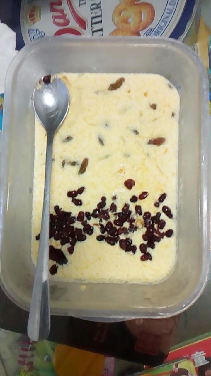 慧er610 做过 适合小朋友的冰淇淋(介意生鸡蛋的进)消耗淡奶油的好办法 #零食#儿子昨天吃了薯条,今天吵着要吃冰淇淋😥这个天气淡奶油打发真不容易,没有达到预期效果,蛋奶糊熬成块状的了,一半葡萄干,一半蜜豆,五点放进冰箱,九点拿出来都已经很硬了,味道还是很不错,奶味很浓哦😄 2017-06-04