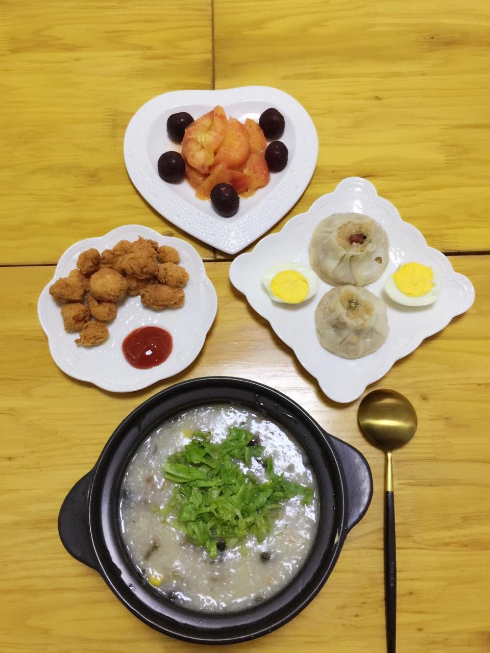 做了一个改良版的皮蛋瘦肉粥😄(里面加了胡萝卜青豆和玉米)鸡米花、咸蛋黄烧卖+水果