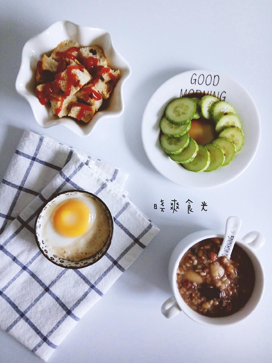 书焙时光 做过 早餐•2017年6月7日 #早餐•2017年6月7日##不浪费好好爱##早餐马拉松~#记录早餐DAY46此刻想法是~杂粮粥不仅水少,米也少一种。卧鸭蛋油少了。黄瓜不想炒,就淋了余留的糖醋汁。面包想配花生酱又觉得干,于是改成番茄酱。[皱眉]这样一顿奇葩的早餐就完成了[耶] 2017-06-07