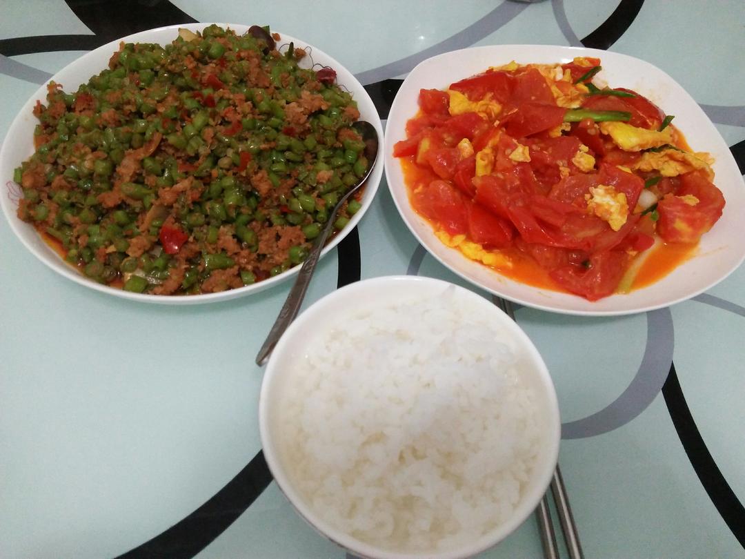 肉沫豆角,番茄炒蛋,白粥