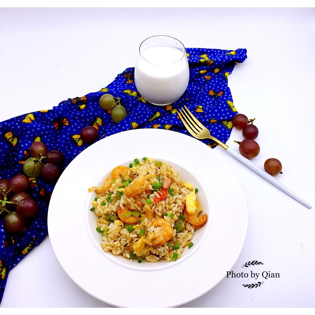 今日早餐 杂粮炒饭 (红薯 花生 青椒 鸡蛋 虾仁) 牛奶🐮