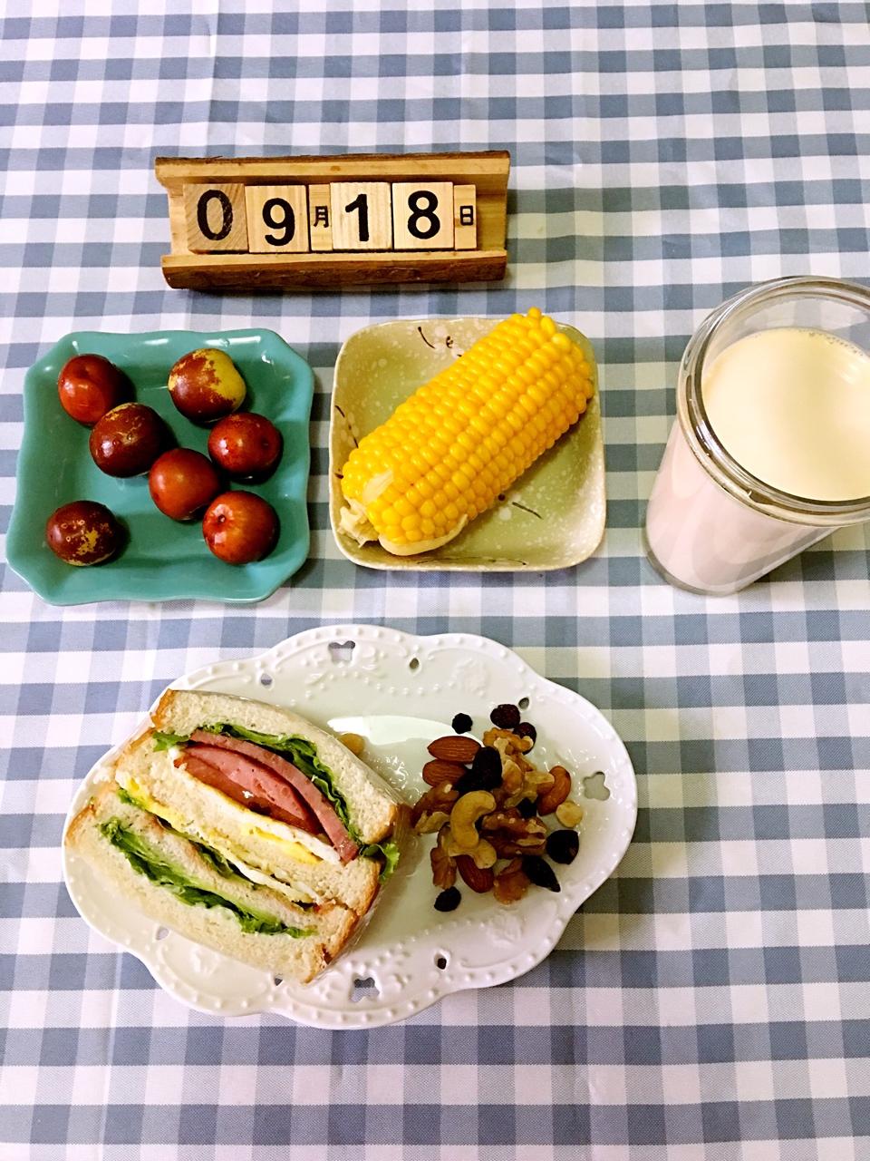 记录初中生的营养早餐,超厚三文治,水煮玉米,奶茶,每日坚果,冬枣