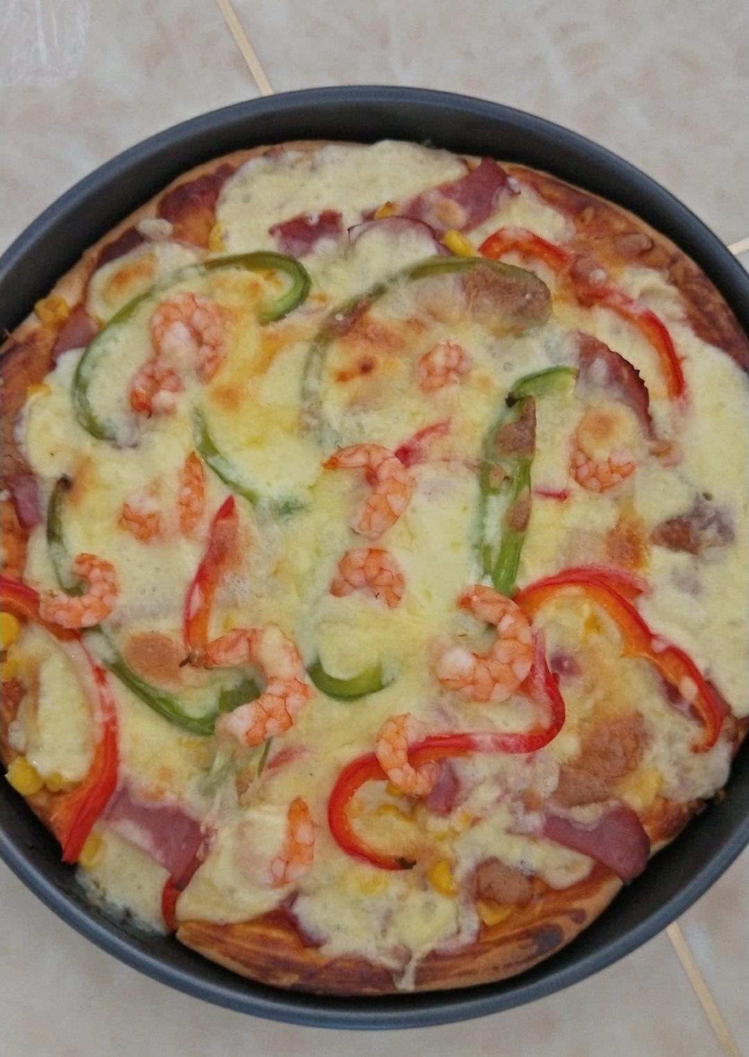 鲜虾培根披萨,芝士不够拉丝,下次换芝士