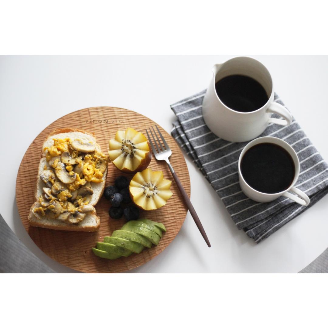 丁一之夏 做过 早餐•2017年10月18日 2017·10·18。早安。蘑菇鸡蛋opensandwich、咖啡、牛油果磨点海盐和黑椒(突然觉得牛油果这个吃法很好吃)、奇异果以及便宜但不好吃的蓝莓。 #早餐•2017年10月18日# 2017-10-18