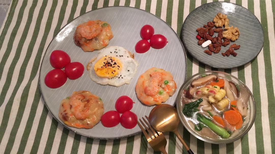早安!🌹土豆泥虾仁饼、菌菇蔬菜汤