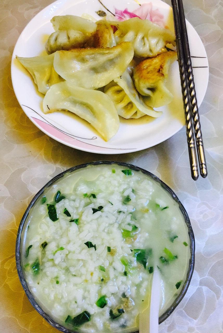 韭菜煎饺,青菜肉沫粥